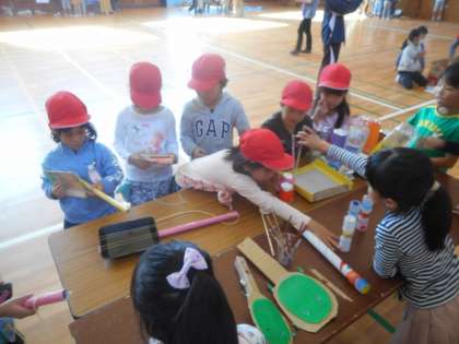 工夫して作られた遊びや道具がたくさんあり、とても楽しい時間を過ごすことができました。これからも様々な場面で交流を深めていってほしいと願っています。