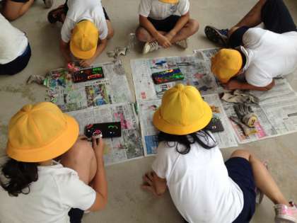 焼き板を作っています。適当な大きさに切った板を焼いて、黒くなったところを磨くと、つやが出て、木目もうきあがってきます。そこに思い思いの絵を描いたり、色をつけたりします。1つ1つの板は、木目も違えば、焼け具合も違います。だから、世界に1つだけの焼き板ができあがります。どんな素敵な林間の思い出の品ができあがることでしょう。焼き板を見ながら、林間のお土産話をしてくれるのが楽しみです。
