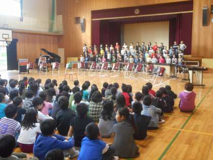 4年生の合唱や合奏の後、多くの子どもたちが感想を4年生に伝えました。本番もがんばって欲しいと思います。