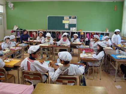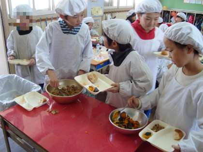2学期の給食も本日で最後となりました。いつもとは違った机の並べ方で、給食の時間を楽しんでいる学級もありました。