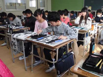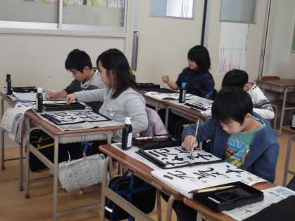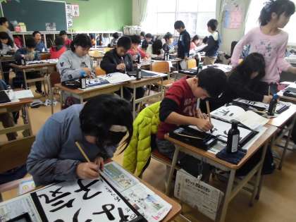 三学期が始まり、子供たちは、元気いっぱいです。早速平成最後の書初めに挑戦しました。手や顔まで墨で汚しながら、一生懸命書いていました。