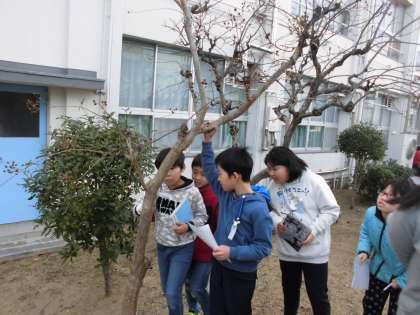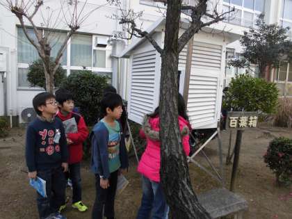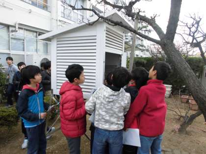 冬の生き物を見つけに校内を探索しました。百葉箱で気温を調べてから、生き物についてワークシートに書き込みました。