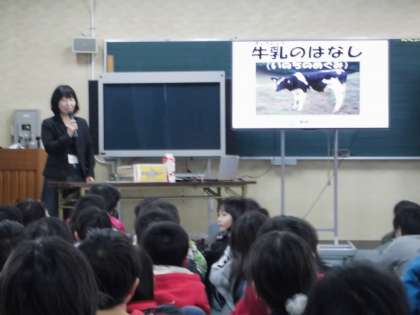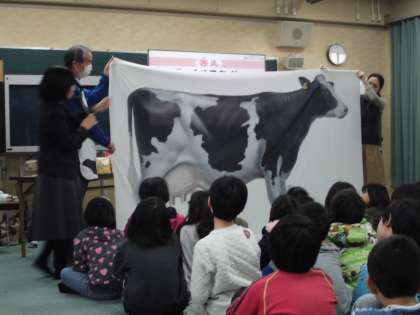 1月18日金曜日5時間目、6時間目にメグミルクの出前教室がありました。毎日給食で飲んでいる牛乳についていろいろと教えていただきました。カルシウムが一番多い飲み物についてのクイズや牛の本当の大きさなどいろいろと教えていただきました。