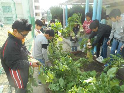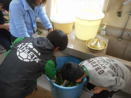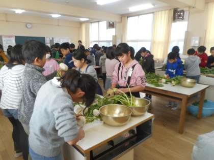 昨日、5年生は学習園で育てていた郷土野菜の天王寺蕪を収穫し、漬物作りをしました。今年度は12月が暖かい日が多かった影響もあってか良く育ちました。みんなで協力して、洗って漬けました。完成が楽しみです。