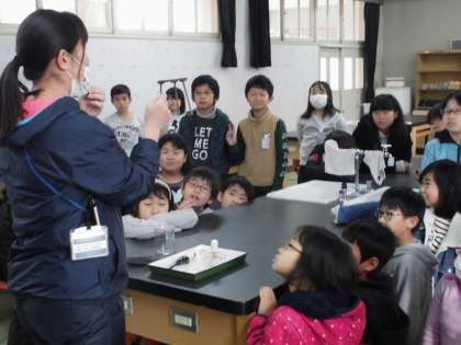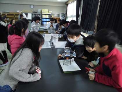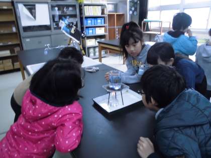 今日の理科の時間も理科室で実験を行いました。ビーカーに水を入れ、スポイトで絵の具をたらしアルコールランプで熱しました。絵の具のひろがりで水の全体のあたたまりかたを調べました。
