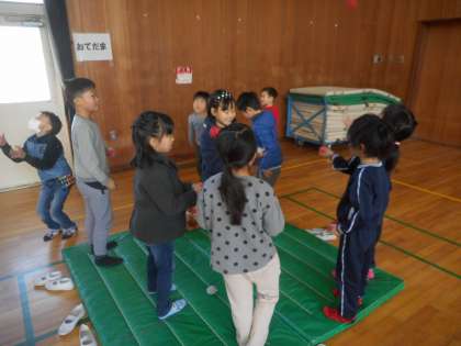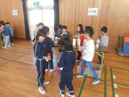 昨日、1年生は保幼小交流会を行いました。先日、昔遊びで教えていただいた遊びを保育園の園児を小学校に招いて教え、一緒に遊びました。