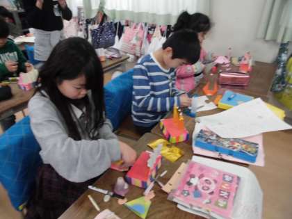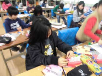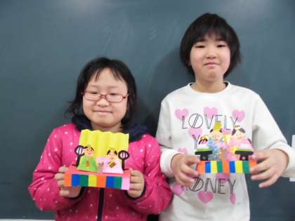 図工でお雛様を作っています。お内裏様やお雛様をそれぞれに工夫しかわいいお雛様が出来上がりつつあります。