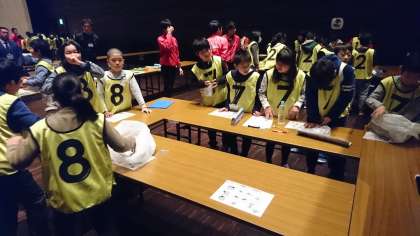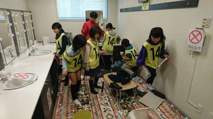 緊急地震速報が流れたら机の下にもぐったり、地震後の部屋の様子を再現した場所で避難したときに必要なものを探したり、避難所での困りごとを解決したりと、グループのみんなで話し合いながら、1つ1つミッションをクリアしていきました。
