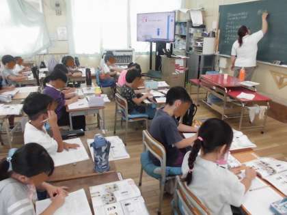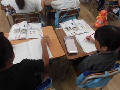算数の学習で、水のかさについて考えていく単元です。2つに容器に入った水のかさを比べるにはどうしたらいいかをみんなで考えていました。