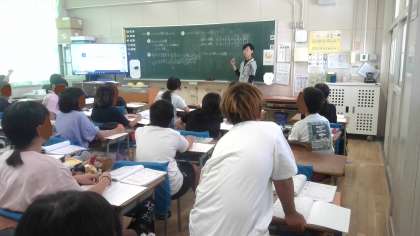 算数の学習です。公倍数と公約数の学習で、公倍数について考えていました。隣の人と相談してかためた意見をみんなに発表して確かめていました。