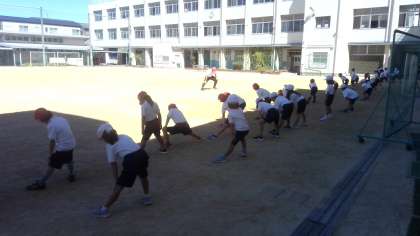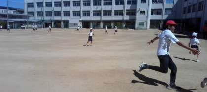 体育の学習です。暑いので準備運動は日陰で行っていました。そのあと、運動場いっぱいに使って鬼ごっこをして汗を流していました。