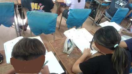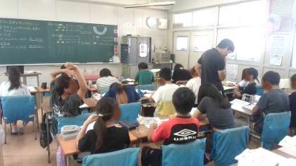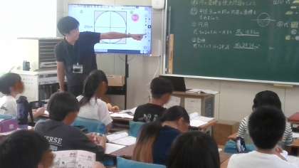 算数の学習です。面積の学習です。四角形の中に円が入った図形で円以外のところの面積を求めるような円の面積を応用して解いていく問題に取り組んでいました。
