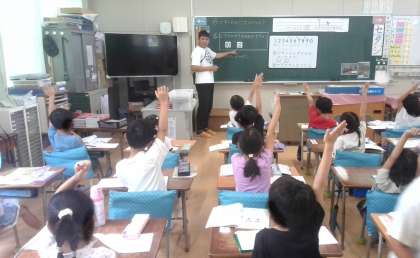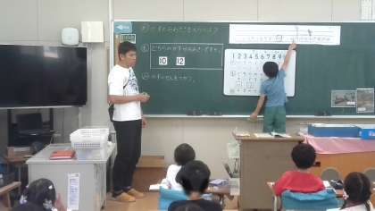 算数の学習です。2つの数のうちどちらが大きいかという課題に取り組んでいました。数の線(数直線につながります)を使っていました。数の線の上では、線上でより右側にある数が大きいことをみんなで見つけたので、その結果を使って課題を解決していました。