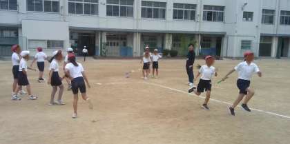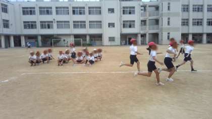 5年生の様子です。体育の学習で陸上運動のリレーをしていました。1学期に学習したバトンパスの仕方を再確認するための練習をしてから試しのゲームをしていました。