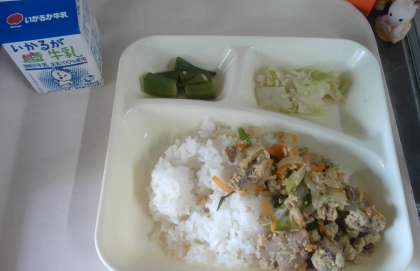 今日の献立は、他人丼、ささみとキャベツの炒め物、オクラの甘酢和え、牛乳です。いただきます。