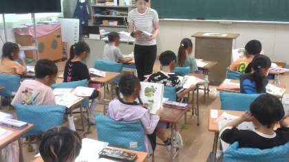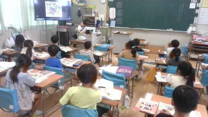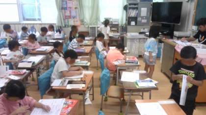 上段の1組は国語のカタカナ練習です。プリントを使って練習していました。中段の2組と下段の3組は道徳、「オオカミと羊飼いのこども」の物語を題材に、うそをつくことについて考えていました。
