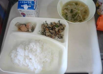 今日の献立は、鮭の醤油だれかけ、五目汁、高野豆腐のいり煮、ごはん、牛乳でした。ごちそうさまでした。