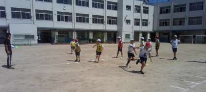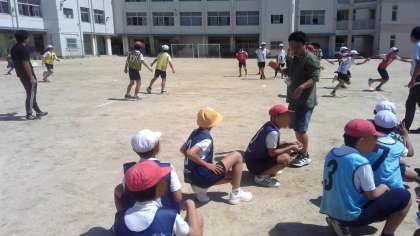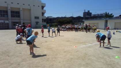 1組・2組・3組合同体育の様子です。リレーのバトンパスを再確認と練習をしていました。各チームのバトンパスのいいところを取り入れられるよう、しっかりと見学していました。