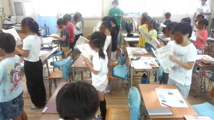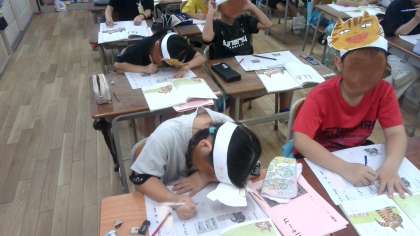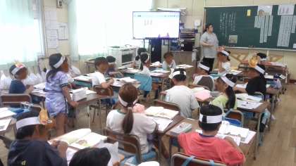 国語の学習で物語文「ニャーゴ」の読み取りをしていました。主人公ニャーゴの気持ちの変化を読み取るため、ニャーゴになりきろうとお面をかぶって学習していました。文章からニャーゴの気持ちの変化を表す場所を見つけ出すことができていました。
