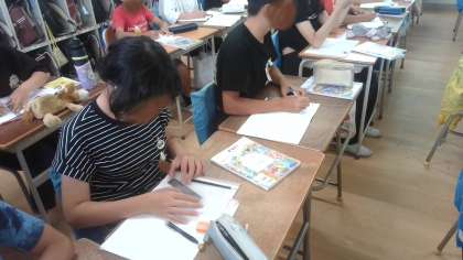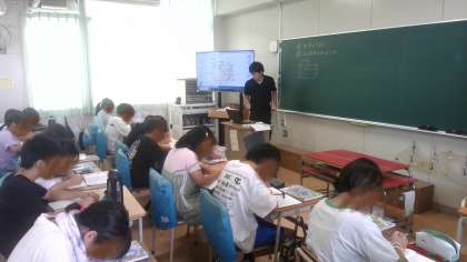算数の学習です。立体の体積を求める課題に取り組んでいました。立方体や直方体などが組み合わさったような立体の体積を求めるために、既習の公式をどう活用したらいいかを考えていました。