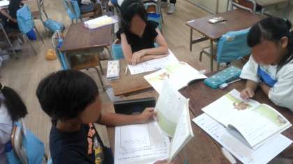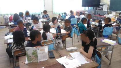 国語の学習で、物語文「ニャーゴ」の読み聞かせ大会の計画を話し合っていました。各班で登場人物の役割を決めたり、読むときに気を付けることを話し合ったりしていました。