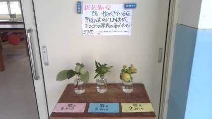今、理科室前コーナーは本校内で実った果実や作物についてのクイズや展示をしています。展示物を見て秋を感じてくれたり自然に興味・関心をもってくれたらうれしいですね。