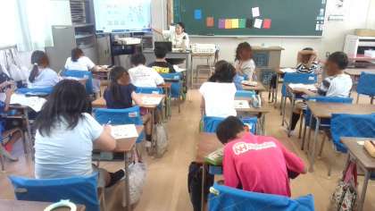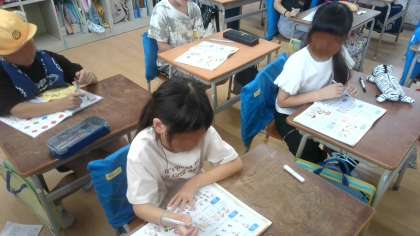英語活動の様子です。モニターの動画を見ながらテキストの問題に答えていく課題でした。1度見ただけではわからなくても、何度か見直しているうちに「あ、そうか」と回答している子がたくさんいました。