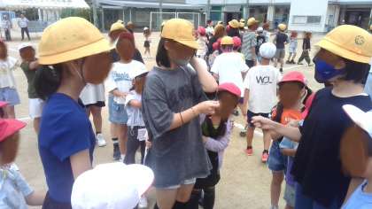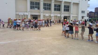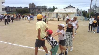運動場活動組は「じゃんけん列車」で楽しんでいました。曇り空で比較的に涼しかったのでよかったです。