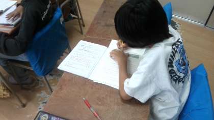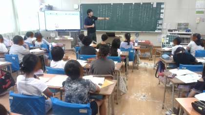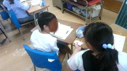 国語の学習です。物語文の読み取りで、第1場面の登場人物や時間などがわかる文章を見つけて場面の様子を話し合っていました。