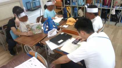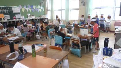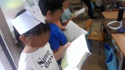 国語の学習で、1年生に読み聞かせをする会に向けて練習していました。各班で役割を決めて練習していました。登場人物のお面も作って頑張っています。
