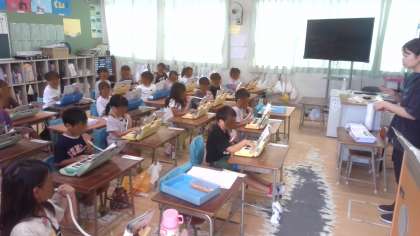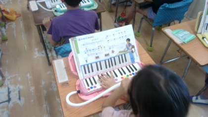 音楽で鍵盤ハーモニカの学習をしていました。教科書の楽譜を見てその音をきれいに出す練習をしていました。