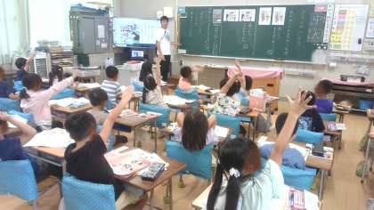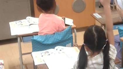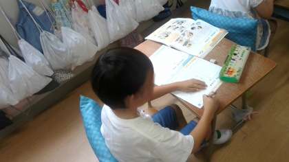 道徳の学習です。近所の人に出会ったとき「挨拶をする」と「挨拶をしないで通り過ぎる」、友だち家に上がるとき「くつをそろえる」「くつをそろえない」など、一つの場面で2種類の挿絵を比べてどちらが気持ちよく過ごせるかを考えていました。