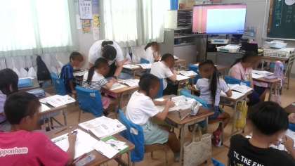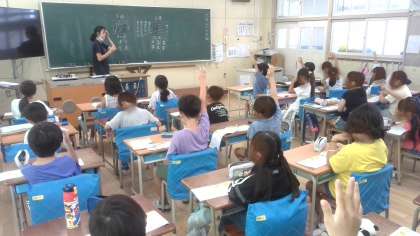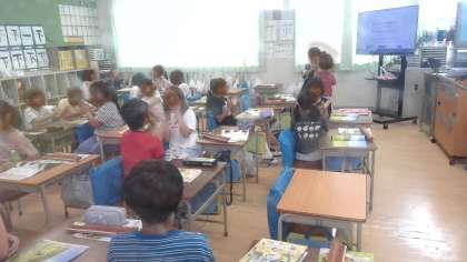上段の1組は算数。円の学習で、コンパスの使い方を学習していました。中段は2組、音楽の学習で、茶摘み歌の手遊びを楽しんでいました。下段は3組、国語の学習で、新出漢字の学習をしていました。