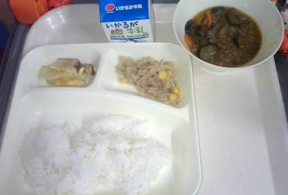 今日の献立は、マーボーナス、ツナと野菜の炒め物、焼きサツマイモの甘みつかけ、ごはん、牛乳です。