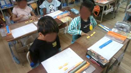 算数の学習です。一皿に2個のった目玉焼きがあり、2皿、3皿と増えていくと目玉焼きはどう増えていくかを考えていました。目玉焼きをブロックに置き換え、友だちとも話しあったりもしながら考え、1皿増えるごとに目玉焼きは2個ずつ増えることを見つけていました。かけ算の2の段の考え方です。