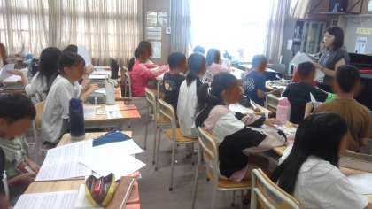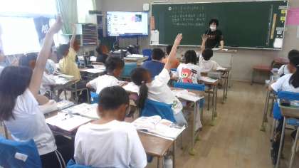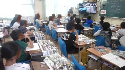 上段の1組と中段の2組は社会科の学習です。1組は、資料集と資料映像を見ながら日本の自動車工業について考えていました。2組は日本の工業地帯や工業地域が海沿いにあることの訳を考えていました。下段の3組は音楽の学習で、合奏に備えて楽譜を作っていました。