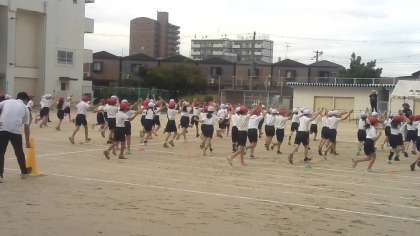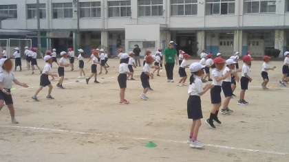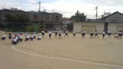 体育で運動会の練習をしていました。団体演技の練習が中心でした。隊形移動も含めて運動場全体を使って頑張っていました。