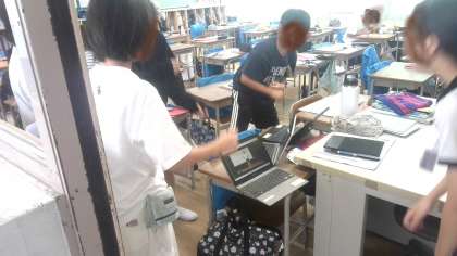 休み時間にタブレットの動画を見ながら、運動会の団体演技の自主練習をしている姿がありました。運動家まであと2週間、気合が入っています。