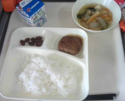 今日の献立は、和風ハンバーグ、五目汁、金時豆の煮もの、ごはん、牛乳です。いただきます。