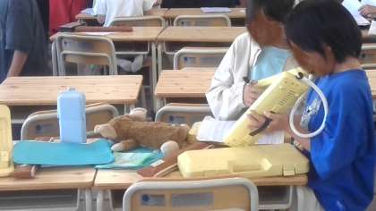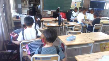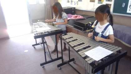 音楽の学習です。合奏練習で、各楽器のパートに分かれて練習していました。