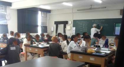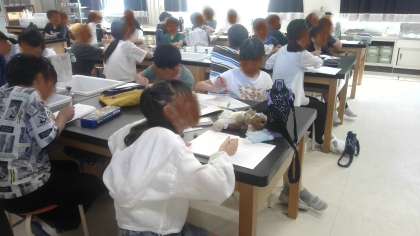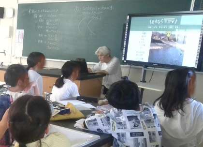 理科の学習で流れる水の働きの学習です。川が岸の土を侵食していく様子をビデオで見ながら先生の説明を聞いていました。