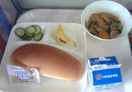 今日の献立は、中華煮、大学芋、あっさりきゅうり、コッペパン、ミカンジャム、牛乳です。いただきます。