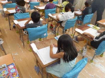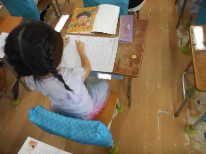 国語の学習です。「サラダでげんき」という物語文の学習で、1年生にとって長文の教材は初めてです。今日は、この物語がどういうお話かを考える学習でした。主人公のさっちゃんが何するお話か、どんな登場人物がいるかなどをみんなで考えていきました。この授業は、本校教員の研究授業として教員みんなで参観しました。