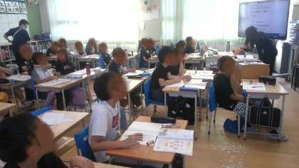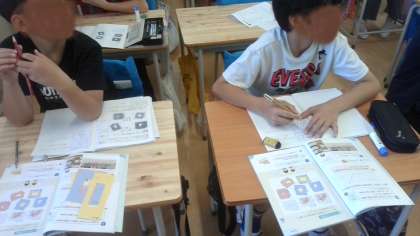 10月9日(木)です。4年生の学習の様子です。算数で図形の学習です。平行四辺形の向かい合う辺について、その名称や性質などについて話し合っていました。