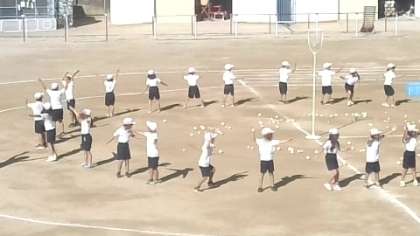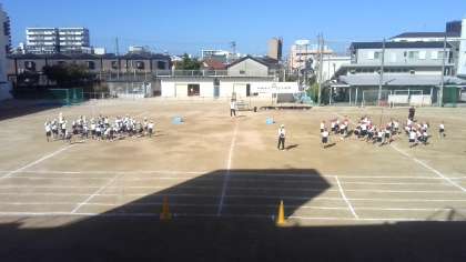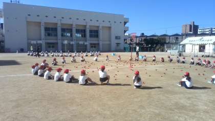 体育で運動会練習で団体競技の玉入れの練習をしていました。自分の立ち位置や始まる前の演技などを中心に練習していました。