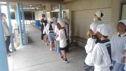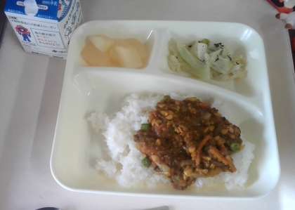 今日の献立は、大豆入りキーマカレーライス、キャベツのひじきドレッシング、和梨(缶)、牛乳です。いただきます。
