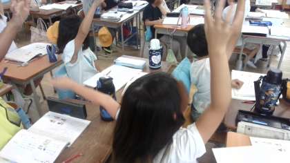 国語の学習です。主語と述語の使い方を学習していました。文中で主語はどれかを見分ける方法で「〜は」の〜が主語であることを発見しました。主語を見つける練習問題では、元気よく挙手する子がたくさんいました。
