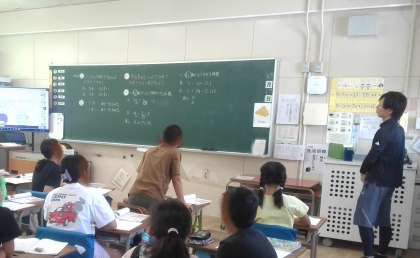 算数の学習です。「5分で50枚印刷できるプリンターと3分で24枚印刷できるプリンターとではたくさん印刷できるプリンターはどちらでしょう」という課題について考えていました。単位量当たりの大きさを求めて考えます。1分簡に印刷できる枚数を求めたり、1枚印刷するのに何秒かかるかを求めたりして比較していました。結果をもとに各自が意見を発表して討論していました。