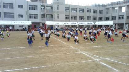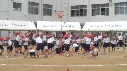 1年生は団体演技「たのしくおどろう,Fun!Fun!Fun!」ではっとをかぶったかわいいダンスを、団体競技でダンスと玉入れをミックスした競技をしました。