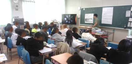 理科の学習です。月の満ち欠けについて、モニターの動画や教科書の資料を基に考えていました。教科書に載っているQRコードをタブレットに読み込んで資料映像を見ていました。